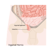 Inguinal hernias most often contain fat or part of the small intestine. In girls or women, inguinal hernias may contain part of the female reproductive system, such as an ovary. When an inguinal hernia occurs, part of the peritoneum—the lining of the abdominal cavity—bulges through the abdominal wall and forms a sac around the hernia.